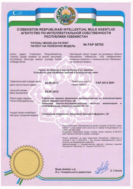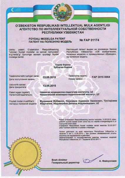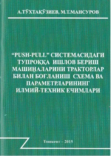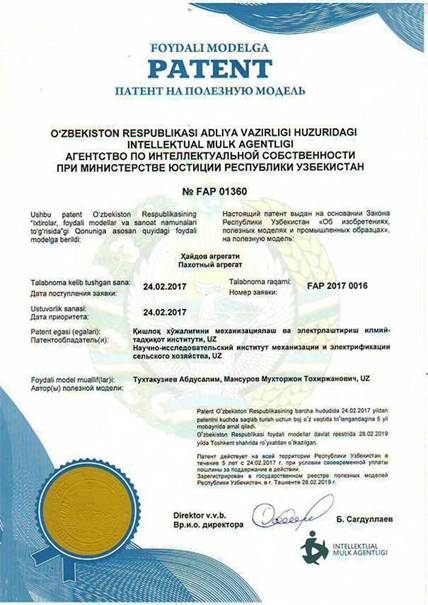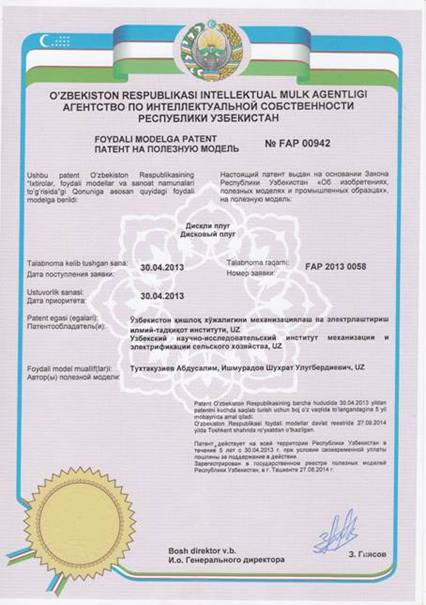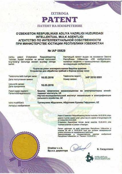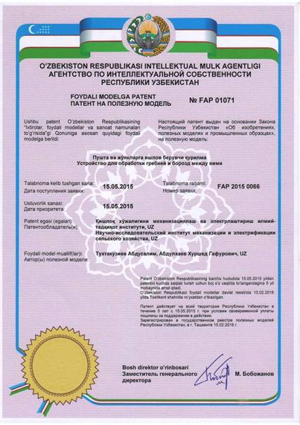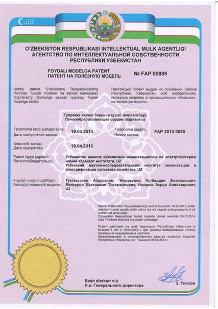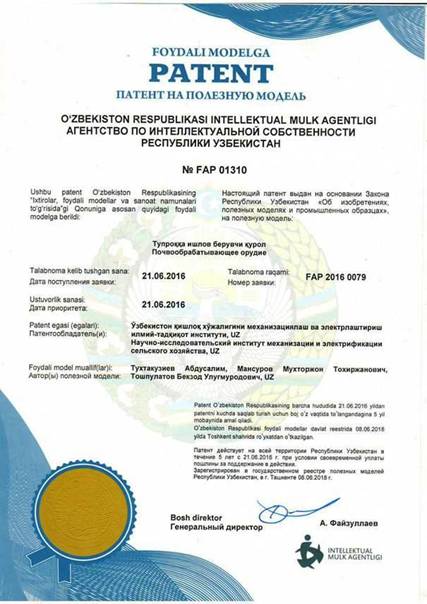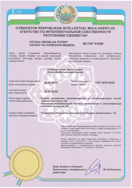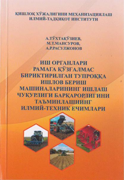 ДЕЯТЕЛЬНОСТЬ ЛАБОРАТОРИИ В НАСТОЯЩЕЕ ВРЕМЯ В настоящее время в лаборатории ведутся теоретические и экспериментальные исследования по созданию новых почвообрабатывающих и планировочных машин, обоснованию их параметров, повышению их агротехнических и экономических показателей, а также по таким актуальным научно-прикладным задачам, как снижение их энерго-металлоемкости и повышение производительности. В 2018-2021 года в лаборатории проведены научно-исследовательские работы по следующим прикладным и фундаментальным проектам: 1. КХФ-2-001 “Научные основы обеспечения равномерности хода почвообрабатывающих машин по глубине”. Руководитель проекта д.т.н., профессор А.Тухтакузиев. 2. КХ-Атех-2018-155 “Разработка навесного широкозахватного мала-выравнителя с быстро и удобно регулируемым удельным давлением на почву”. Руководитель проекта д.т.н., профессор А.Тухтакузиев. 3. МВ-Итех-2018-30 “Разработка и проведение испытаний комбинированного агрегата для предпосевной обработки почвы и сева семян мелкосеменных культур”. Руководитель проекта д.т.н., профессор А.Тухтакузиев. 4. КХ-Атех-2018-393 “Разработка комбинированной машины с быстрозаменяемыми унифицированными рабочими органами для подготовки почвы к севу повторных культур различными способами”. Руководитель проекта к.т.н., с.н.с. Б.В.Хушвактов. 5. КХ-Итех-2018-24 “Изготовление промышленного образца и внедрение в сельхозпроизводство машины для обработки свежевспаханных полей”. Руководитель проекта д.т.н., с.н.с. К.Б.Имомкулов. 6. КХ-Итех-2018-25 “Изготовление промышленного образца и внедрение в сельхозпроизводство широкозахватного чизель-культиватора” Руководитель проекта д.т.н., с.н.с. М.Т.Мансуров. 7. ЁКХ-Атех-2018-46 “Обоснование параметров плуга, агрегатируемого с овощеводческим трактором”. Руководитель проекта PhD., с.н.с. Б.Ш.Гайбуллаев. 8. ЁКХ-Атех-2018-47 “Разработка устройства для измерения глубины обработки почвообрабатывающих машин”. Руководитель проекта PhD., с.н.с. Д.Абдуваҳобов. 9. T-QX-2021-177 “Проведение опытно-конструкторских работ с целью подготовки к коммерциализации широкозахватного навесного мала-выравнивателя с быстро и легко регулируемым давлением на почву”. Руководитель проекта т.ф.д., проф. А.Тухтакузиев С целью обеспечения лаборатории молодыми научными кадрами для выполнения этих проектов привлечены докторанты М.М.Халилов, Ш.Н.Барлибоев, А.Р.Расулжонов. В 2021 году сотрудниками лаборатории опубликовано 54 работ, из них 2 патента, 2 монографии, 14 статей опубликованы в республиканских и 4 в иностранных журналах, а также 12 – в республиканских научно-технических конференциях, 5 – в международных научно-технических конференциях. СОТРУДНИЧЕСТВО ЛАБОРАТОРИИ Для качественного выполнения научно-исследовательских работ налажено сотрудничество с республиканскими и зарубежными высшими учебными заведениями, научно-исследовательскими институтами, а также с другими организациями, в частности с Ташкентским государственным техническим университетом, Ташкентским государственным аграрным университетом, Ташкентским институтом инженеров ирригации и механизации сельского хозяйства, Андижанским филиалом Ташкентского государственного аграрного университета, Самаркандским институтом ветеринарной медицины, Наманганским инженерно-строительным институтом, Ферганским политехническим инстит