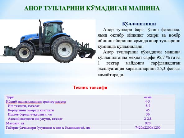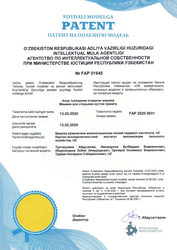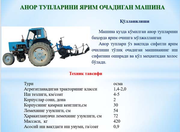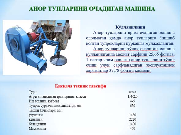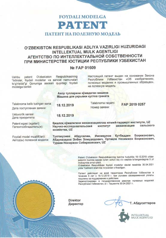 – anor tuplarini ko‘madigan mashinani sanoat nusxasini ishlab chiqish va bog‘dorchilik klasterlari ishlab chiqarishiga joriy etish;
