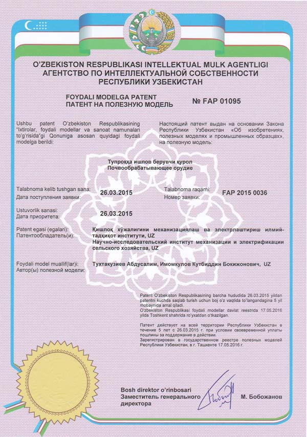 – bog‘, tokzorlarda daraxtlar va tok tanalari atrofi tuproqlariga ishlov berishga moslanuvchan traktor bilan agregatlanadigan moslamalarni ishlab chiqish va parametrlarini asoslash;