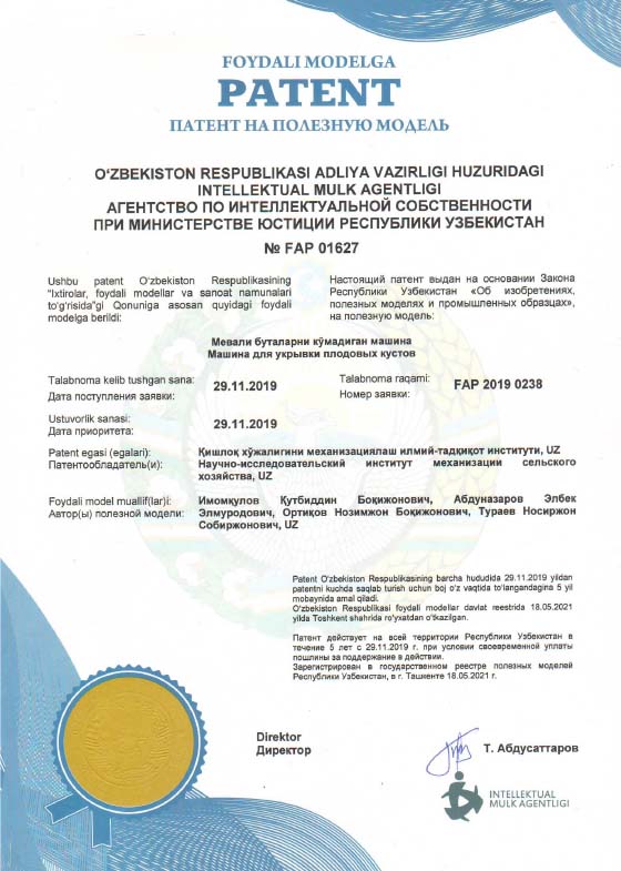 – bog‘ va toklarda kesilgan shoxlar tok novdalarini maydalash hamda kelgusi mulcha sifatida foydalanish uchun mashinalashgan texnologiya va mashinani ishlab chiqish va sinovlarini o‘tkazish;