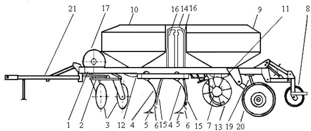 1-rasm. Kombinatsiyalashgan pnevmatik ekkich laboratoriya-dala qurilmasi ish organlarining joylashuv sxemasi Ramaning ustki qismida urug‘ bunkeri 9 va mineral o‘g‘it bunkeri 10 o‘rnatilgan bo‘lib, ularning pastki qismida me’yorlagichlar 11, 12 joylashtirilgan. Me’yorlagichlarga rama yon tomonda o‘rnatilgan g‘ildirak 13 yordamida zanjirli uzatmalar vositasida harakat uzatiladi. Bunkerlar oralig‘ida urug‘larni taqsimlagich 14 o‘rnatilgan bo‘lib, prujinali stoykaga mahkamlangan urug‘yo‘naltirgich 15 lar bilan urug‘o‘tkazgich 16 lar vositasida bog‘langan. Ramaning old qismidagi ventilyator 17 me’yorlagich 11 va urug‘taqsimlagich 14 bilan quvur 18 orqali bog‘langan. Qurilmani transport holatidan ish holatiga o‘tkazish va aksincha, ramaga gidrotsilindr 19 vositasida rostlanadigan qilib o‘rnatilgan g‘ildirak 20 orqali amalga oshiriladi. Qurilmani energiya vositasi bilan agregatlash uchun tirkash qurilmasi 21 ko‘zda tutilgan. Gidravlik yuritma vositasida g‘ildirak 20 o‘z o‘qi bilan birga ramaga yaqinlashtiriladi va qurilma ish holatiga o‘tadi. Qurilmada yerni yumshatish va ekish texnologik jarayonlari quyidagicha kechadi. Birinchi va ikkinchi qatorda joylashgan diskli ishchi organlar 3 yerga 150 mm chuqurlikkacha kirgan holda ishlov berib, yer yuzasidagi o‘simlik qoldiqlarini tuproqqa aralashtiradi. Uchinchi va to‘rtinchi qatordagi prujinali stoyka 4 larga o‘rnatilgan qanotli panja 5 larning har biri tuproqqa 270 mm kenglikda va 200 mm chuqurlikda ishlov beradi. Prujinali stoykaga o‘rnatilgan yo‘lakshakllantirgich 6 tuproq namligi va urug‘ ekishga qo‘yilgan talablardan kelib chiqib, 140 mm kenglikda va 20-100 mm chuqurlikdagi tubi yengil zichlangan yo‘lakni shakllantiradi. Urug‘ bunkeri 9 ning tubida joylashgan va harakatni g‘ildirak 13 dan zanjirli uzatma vositasida oladigan me’yorlagich 11 tomonidan ajratilgan urug‘lar ventilyator 17 tomonidan hosil qilingan havo oqimi yordamida quvur 18 bo‘ylab taqsimlagich 14 tomonga yo‘naltiriladi. Taqsimlagichda urug‘lar urug‘o‘tkazgich 16 larga taqsimlanadi va qanotli panja 5 lar hamda yo‘lakshakllantirigich 6 lar tomonidan tayyorlangan yo‘lakchalarga yo‘naltirgich 15 vositasida tashlab beriladi. Yo‘lakchalarning eni bo‘ylab bir tekis tashlab berilgan urug‘lar ko‘mgich-tekislagich 7 lar vositasida tuproq bilan ko‘miladi. Keyingi jarayon yo‘lakchalar ustidagi yumshoq tuproqni yuza zichlash jarayoni bo‘lib, u zichlovchi katok 8 yordamida amalga oshiriladi. Keltirilgan sxemadagi kombinatsiyalashgan pnevmatik ekkichning tuproqqa minimal ishlov beruvchi hamda urug‘ni pnevmatik usulda ekuvchi qismlari tayyorlanib, dala sharoitida dastlabki tekshiruvdan o‘tkazildi. Texnologik jarayonlarning bajarilish ketma-ketligi bo‘yicha mashina asosiy ramasining oldingi qismida ish organlarining birinchi moduli, ya’ni individual sferik disklar ikki qator joylashtirilgan bo‘lib, tuproqqa 10 sm gacha ishlov beradi (2-rasm).