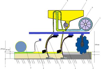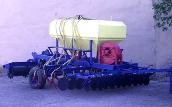 2-rasm. Kombinatsiyalashgan pnevmatik ekkichning laboratoriya-dala qurilmasi O‘rta qismida ikki qator chizelli ish organlari o‘rnatilgan va undan keyingi qatorda bir qator qilib, ko‘mgich tekislagich joylashtirilgan bo‘lib, ramaning orqasiga tuproqni zichlab, kesaklarni ezuvchi katok o‘rnatilgan. Mashinaning bunkeri asosiy ramaning ustiga joylashtirilgan bo‘lib, bunker ikki kameraga ajratilgan. Birinchi kamera o‘g‘it solishga mo‘ljallangan va bunkerning ostiga o‘g‘it me’yorlagich joylashtirilgan. Ikkinchi kamera urug‘ ekishga mo‘ljallangan bo‘lib, bunkerning orqa tomoni ostiga me’yorlagich o‘rnatilgan. Me’yorlagichdan o‘tgan urug‘larni taqsimlash uchun bunkerning ichida urug‘ taqsimlagich joylashtirilgan va urug‘o‘tkazgichlar vositasida ekkichlarga (yo‘lakshakllantirgichga) biriktirilgan. Urug‘ ekuvchi yo‘lakshakllantirgichlar esa ikki qator qilib ramaga o‘rnatilgan chizelli ish organlari stoykasiga biriktirilgan. Urug‘ ekuvchi ish organlari birinchi qatorda 7 ta, ikkinchi qatorda 8 ta joylashtirilgan. Urug‘ ko‘mgich-tekislagichlar esa 8 ta yo‘lakchadagi urug‘ni ko‘mish uchun mo‘ljallab alohida joylashtirilgan. Urug‘ ko‘mgich-tekislagichni tayyorlashda o‘lchami 900x70x8 mm bo‘lgan 65 G rusumli po‘lat materialdan foydalanildi. Kombinatsiyalashgan pnevmatik ekkich konstruksion tuzilishiga ko‘ra, asosiy bo‘ylama ramaga rostlanish imkoniyati bilan biriktirilgan kichik ramaga alohida-alohida o‘rnatiladigan diskli ish organlar, asosiy ramaga ikki qator qilib joylashtirilgan prujinali stoykalarga o‘rnatilgan qanotli yumshatuvchi panjalar, yo‘lakshakllantirgichlar, bir qator qilib ramaga biriktirilgan ko‘mgich-tekislagichlar va rostlanuvchan zichlovchi katokdan iborat. Ramaning ustki qismida urug‘ va mineral o‘g‘it bunkeri o‘rnatilgan bo‘lib, ularning pastki qismida me’yorlagich joylashtirilgan. Me’yorlagichga ramaning pastki qismiga o‘rnatilgan g‘ildirak yordamida zanjirli uzatmalar vositasida harakat uzatiladi. Urug‘larni taqsimlagich bunker ichida o‘rnatilgan bo‘lib, taqsimlagichdan tushayotgan urug‘lar urug‘o‘tkazgich orqali prujinali stoykaga mahkamlangan urug‘yo‘naltirgichlarga havo yordamida yuboriladi va ochilgan yo‘lakchalarga ekiladi. Ramaning old qismidagi ventilyator me’yorlagich va urug‘taqsimlagich bilan quvur orqali bog‘langan. Qurilmani transport holatidan ish holatiga o‘tkazish va aksincha, ramaga gidrotsilindr vositasida rostlanadigan qilib o‘rnatilgan g‘ildirak orqali amalga oshiriladi. Qurilma energiya vositasi bilan tirkash qurilmasi orqali agregatlanadi. Kombinatsiyalashgan pnevmatik ekkichning texnologik ish jarayoni quyidagicha amalga oshadi. 3-rasmda bajariladigan texnologik ish jarayonining sxemasi keltirilgan. Ekkich asosiy rama 1 ga o‘rnatilgan diskli 2, chizelli 3 ish organlaridan, izyopgichlar 4 va katok 5dan tashkil topgan bo‘lib, ular tuproqqa ishlov berish jarayonlarini amalga oshiradi. Rama 1 ning ustida urug‘ bunkeri 7 joylashtirilgan bo‘lib, uning pastki qismiga urug‘larni me’yorlagich 8 joylashtirilgan. Me’yorlagichdan o‘tgan urug‘larni taqsimlash uchun bunkerning ichki qismiga taqsimlagich 9 o‘rnatilgan. Taqsimlagichga biriktirilgan urug‘o‘tkazgich 10 lar urug‘larni urug‘yo‘naltirgich 11 larga yuboradi va ekish jarayoni amalga oshiriladi.